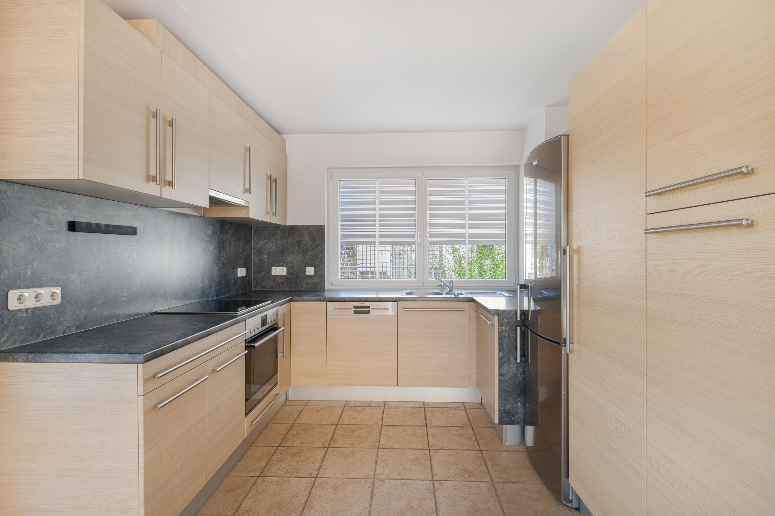 Das erste Obergeschoss besticht durch ein lichtdurchflutetes Wohnzimmer mit hochwertiger Einbauküche inklusive sämtlicher Elektrogeräte. Vom Wohnzimmer gelangt man auf einen ruhigen Balkon zum Innenhof, der Entspannung und Privatsphäre garantiert. Das tageslichtdurchflutete Badezimmer ist modern gefliest und verfügt über eine Badewanne.
