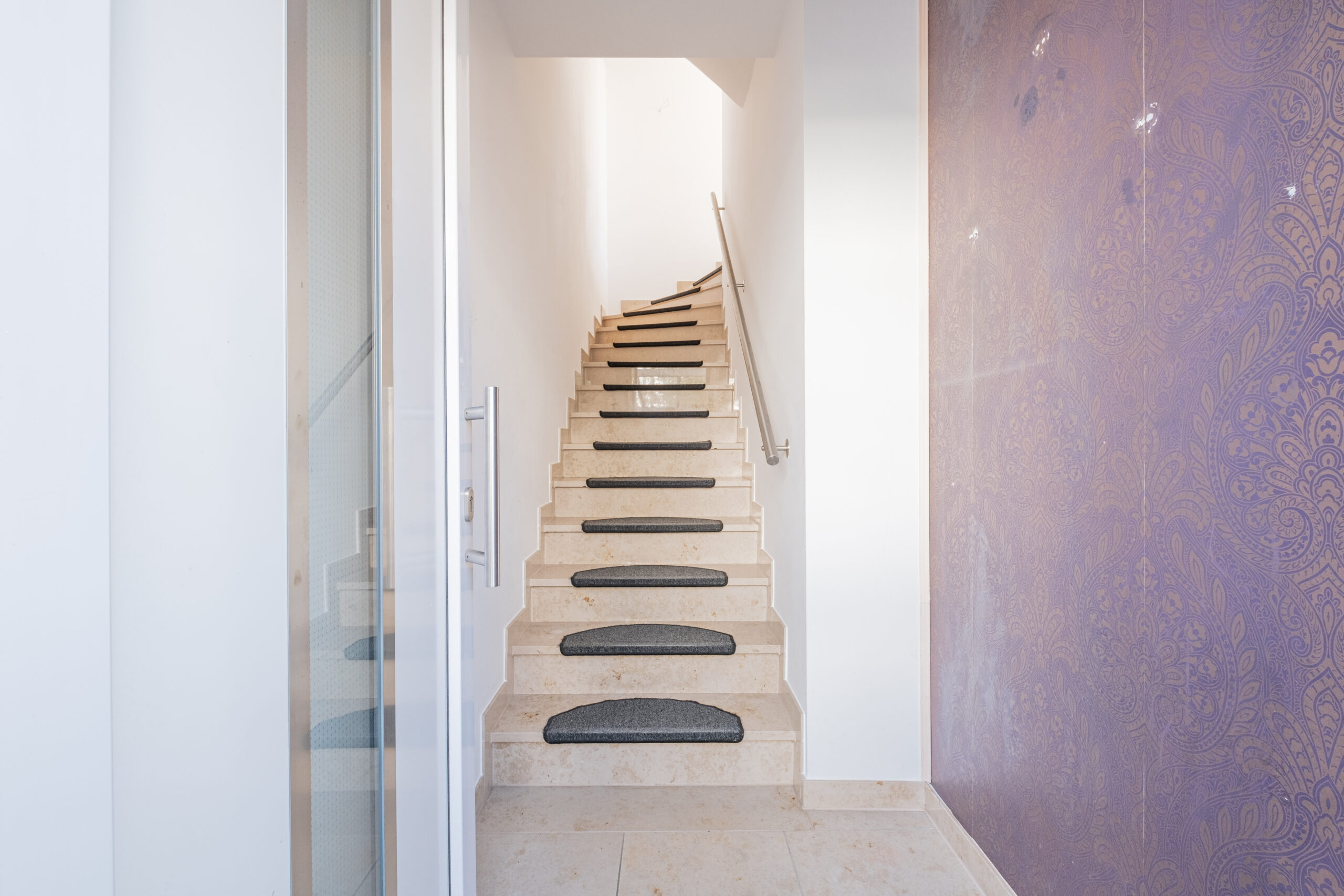 Die Wohnung erstreckt sich über zwei Etagen und vermittelt durch das House-in-House-Konzept das Gefühl, in einem eigenen Reihenhaus zu wohnen. Das Dachgeschoss lässt sich durch das Einziehen einer Trockenbauwand in drei Schlafzimmer unterteilen, während im ersten Obergeschoss eine Trockenbauwand für ein Home Office Zimmer flexibel eingebaut werden kann.