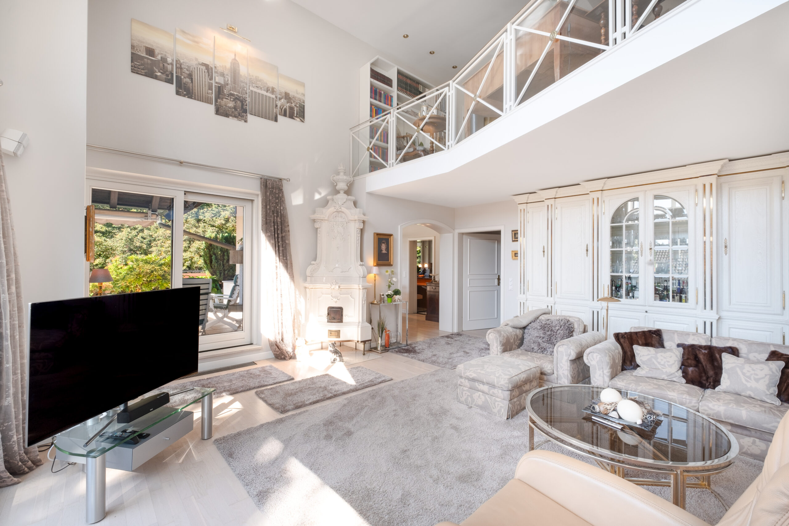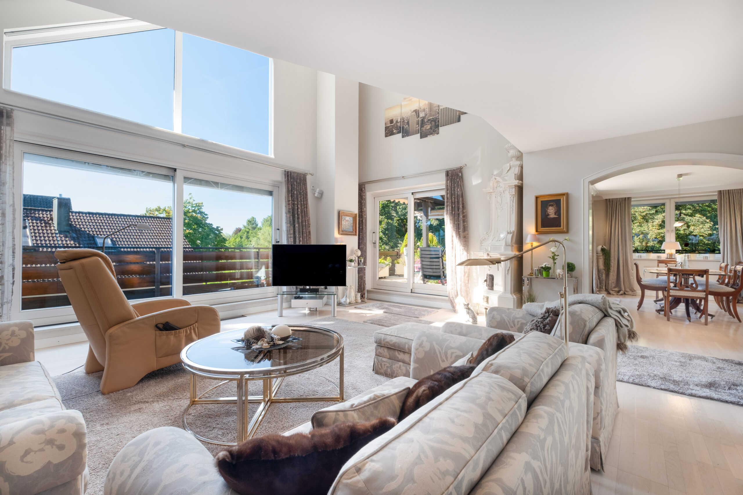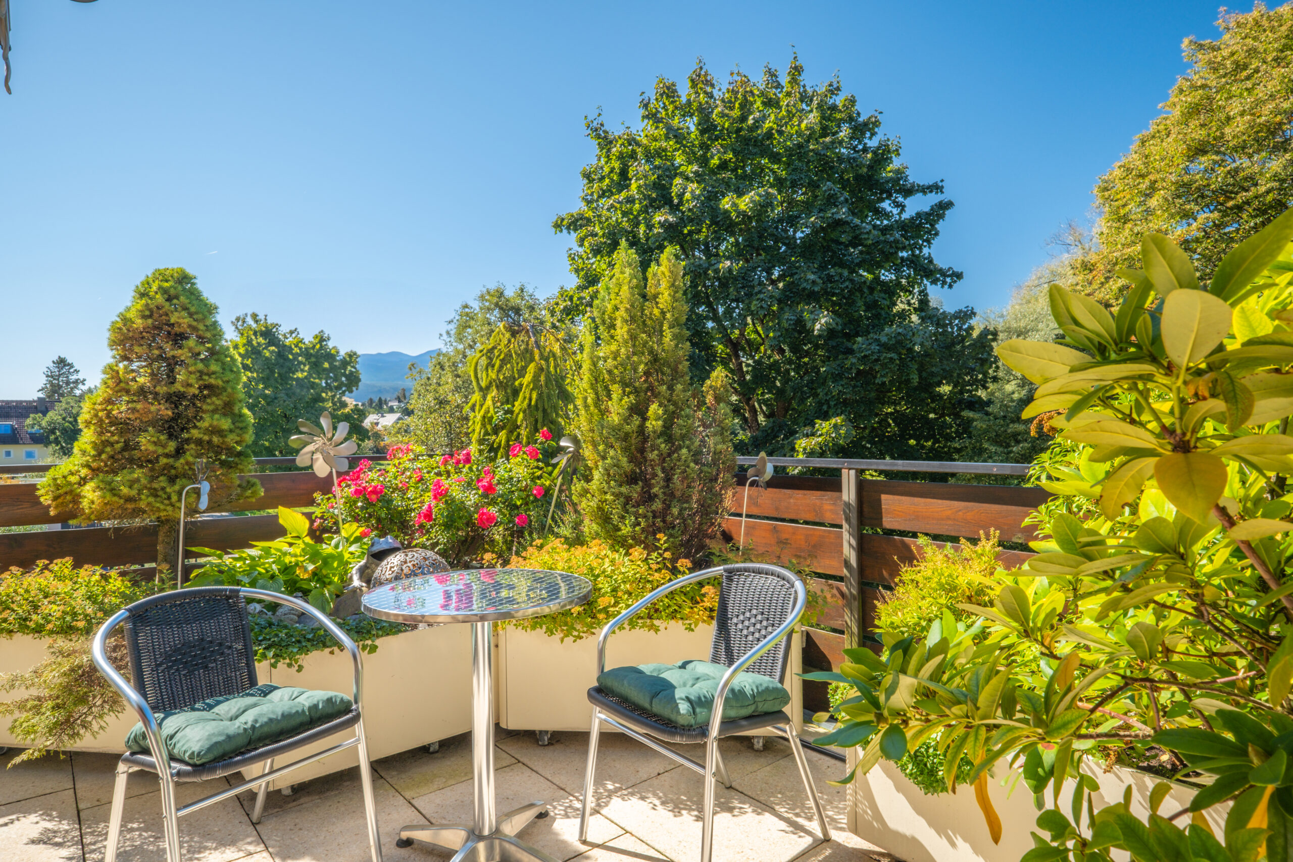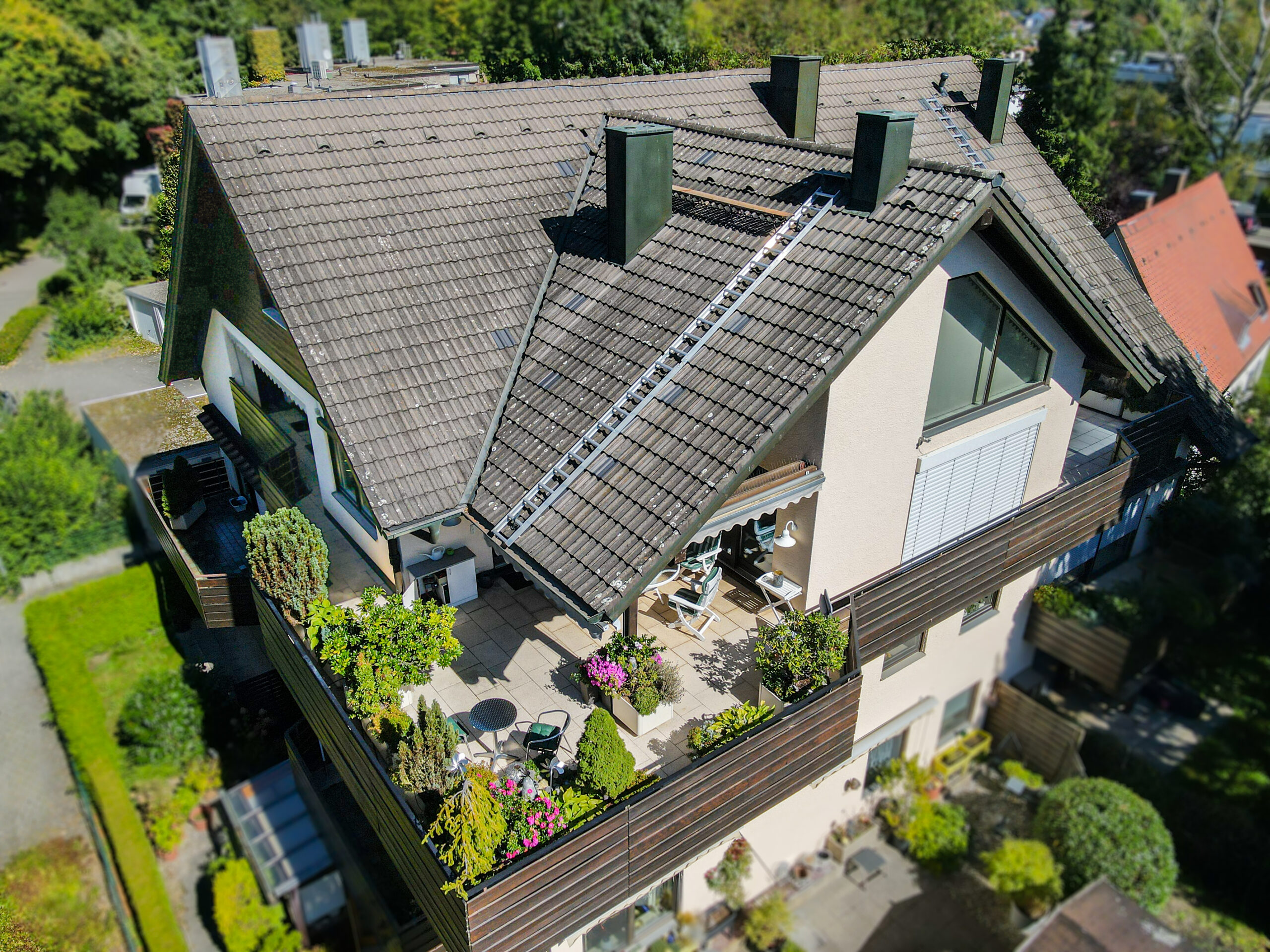 Zum Verkauf steht eine exklusive Penthouse-Maisonette-Wohnung mit großzügiger, sonniger Terrasse, die nahezu ringsum das Gebäude umschließt.