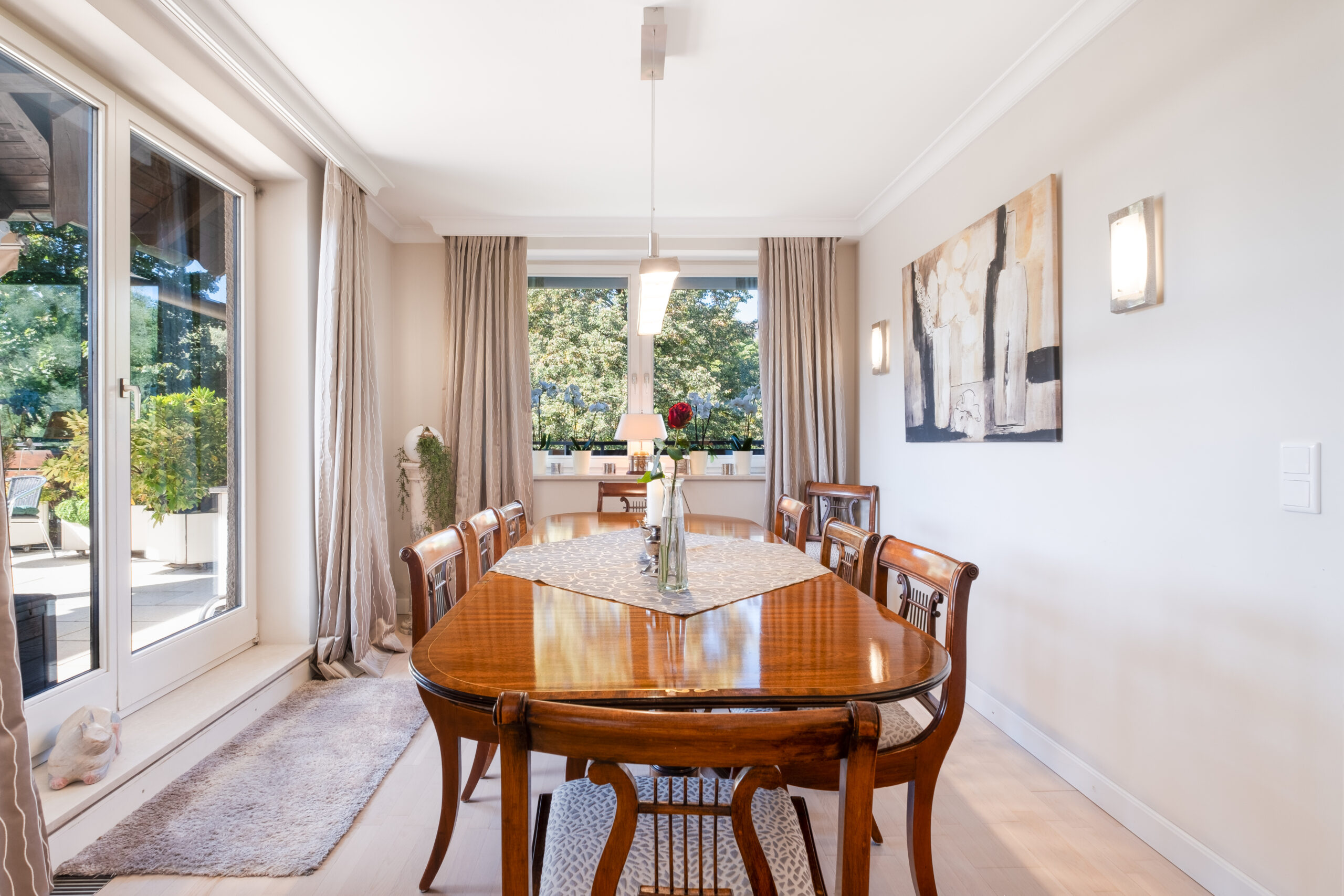 Die Terrasse ist südwestlich ausgerichtet, teilweise überdacht und mit offenem Kamin ausgestattet. Elektrische Markisen und Raffrollos sorgen für Komfort. Vom Esszimmer aus gelangt man über einen überdachten Freisitz direkt auf die Südterrasse.