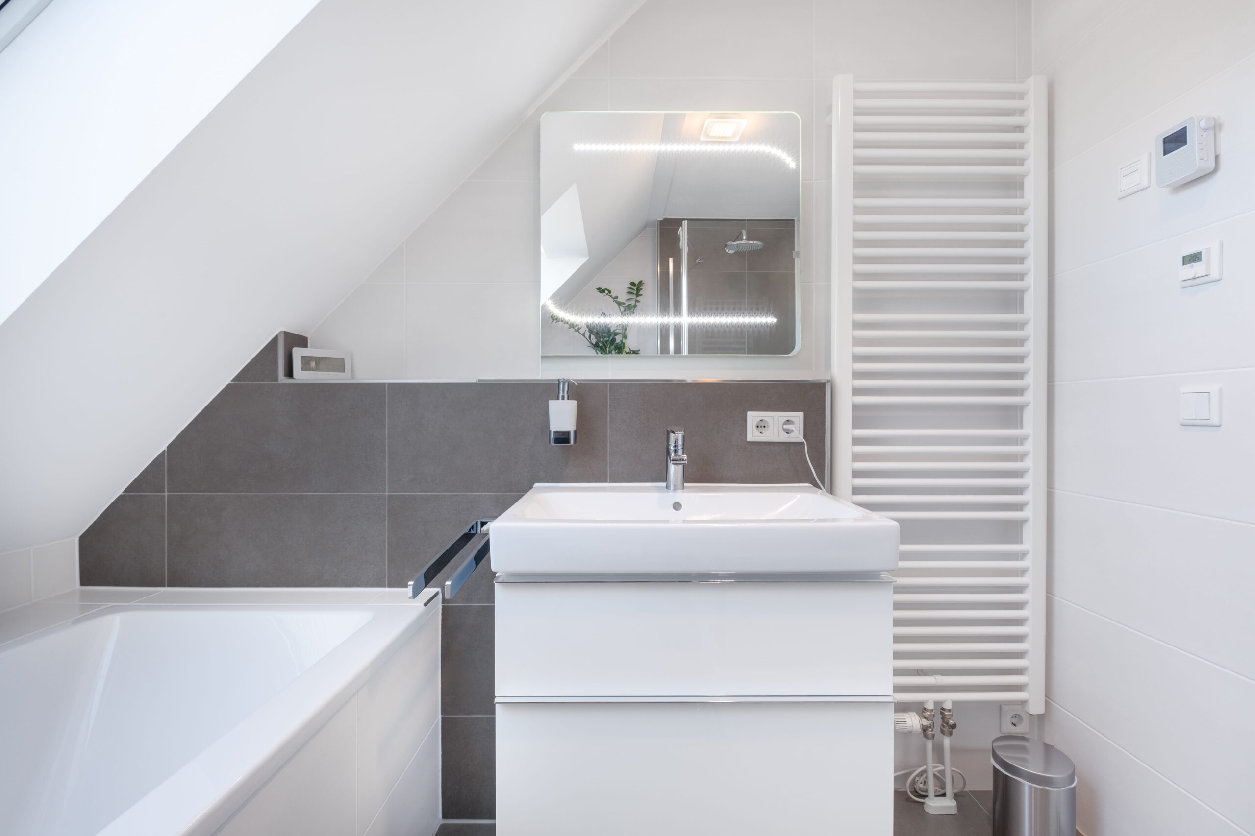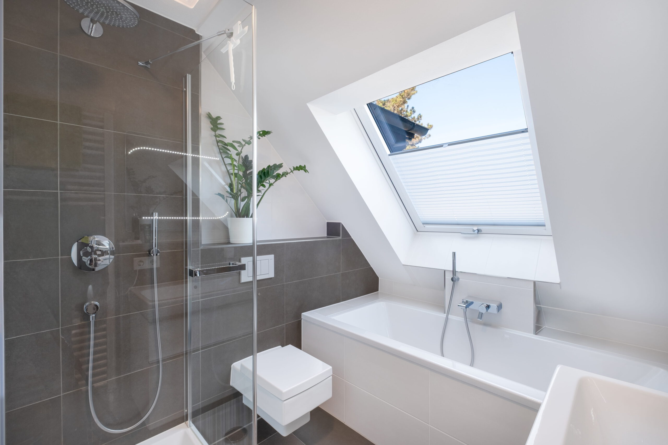 Luxuriöses Tageslichtbad mit Regendusche, Echtglas-Duschkabine und großer Badewanne