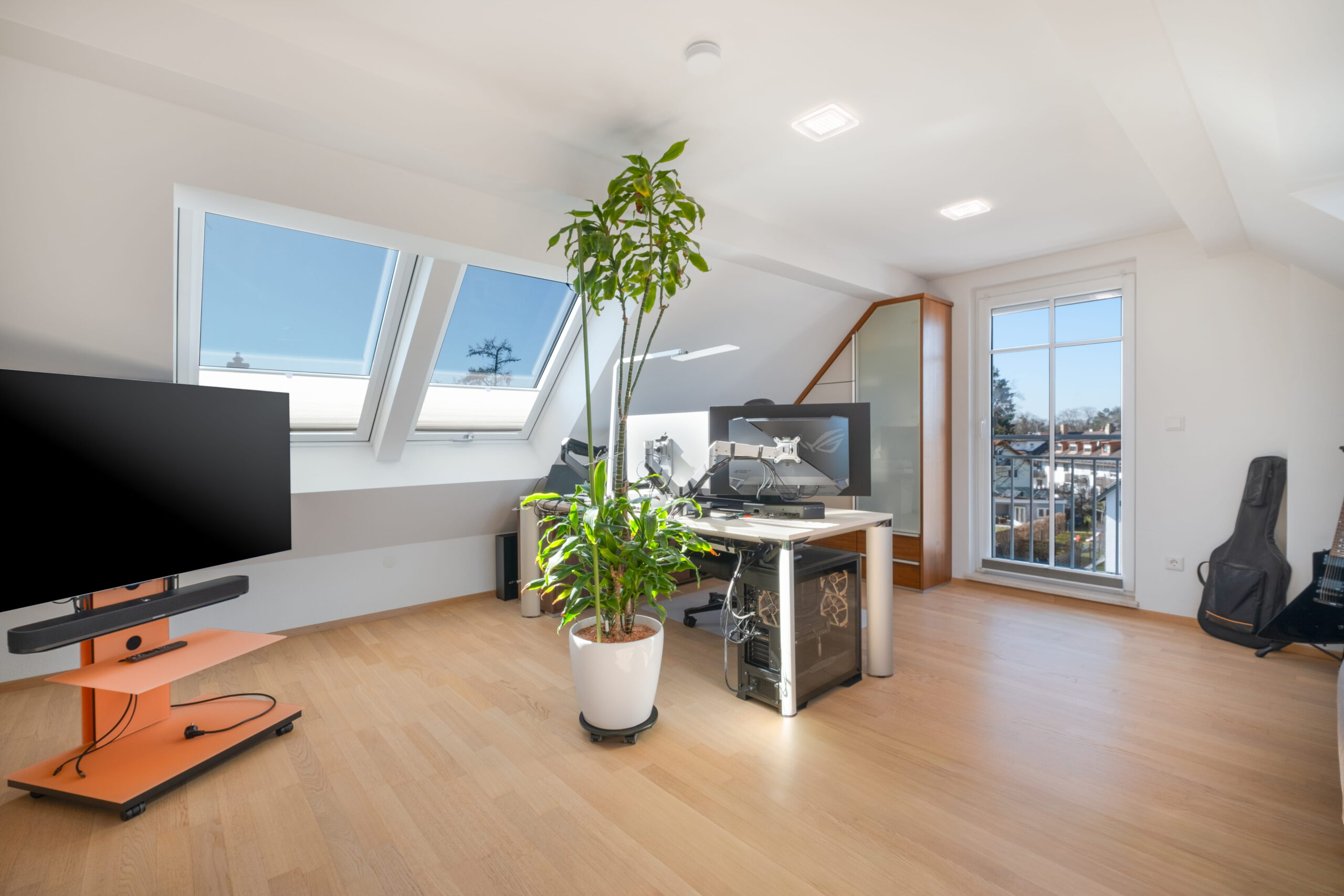 Dachstudio (3. Zimmer) mit großen Dachflächenfenstern und französischem Balkon – ideal als Homeoffice, Hobbyraum oder zusätzliches Schlafzimmer