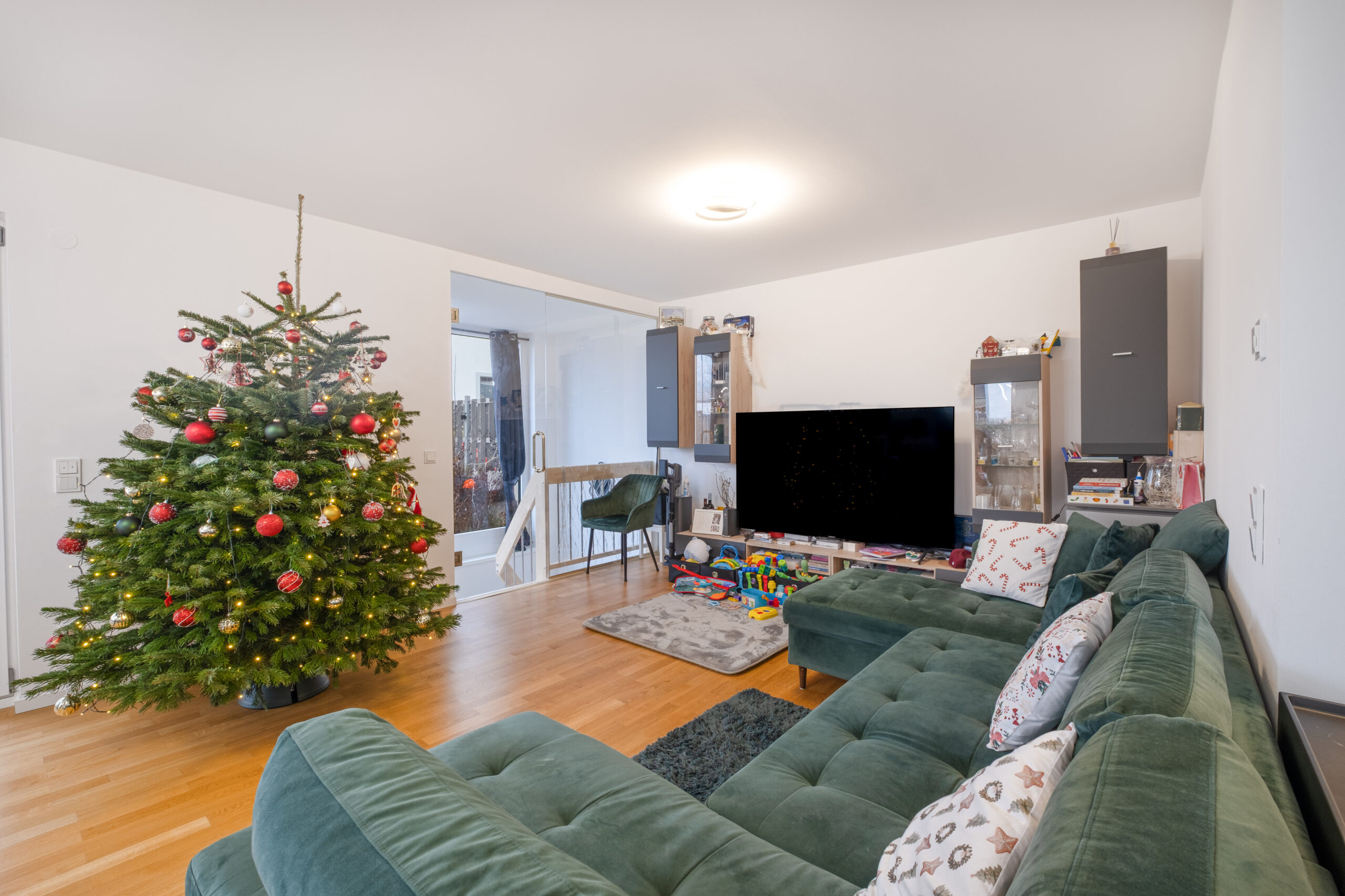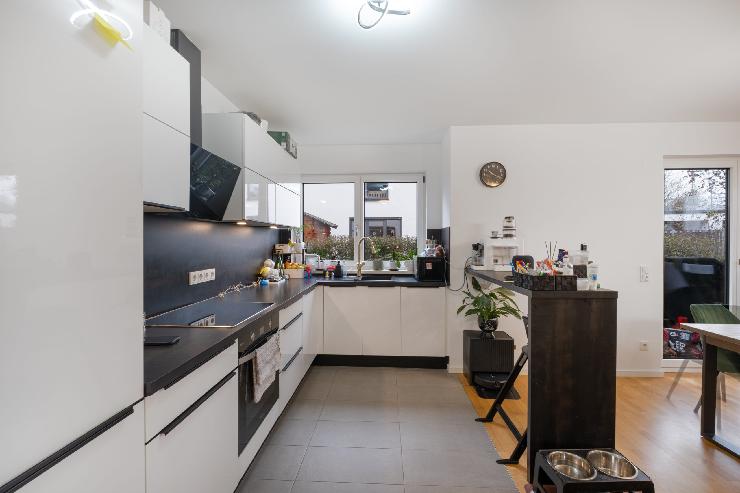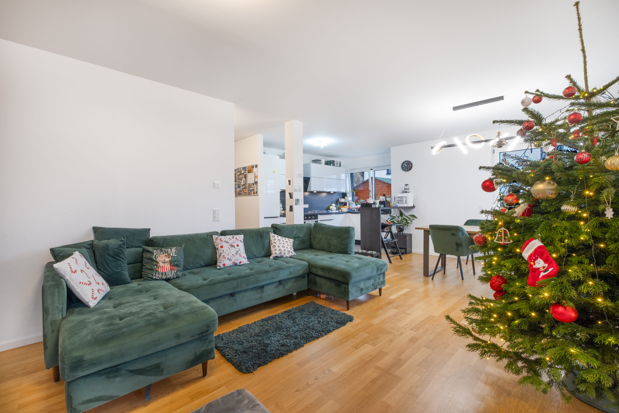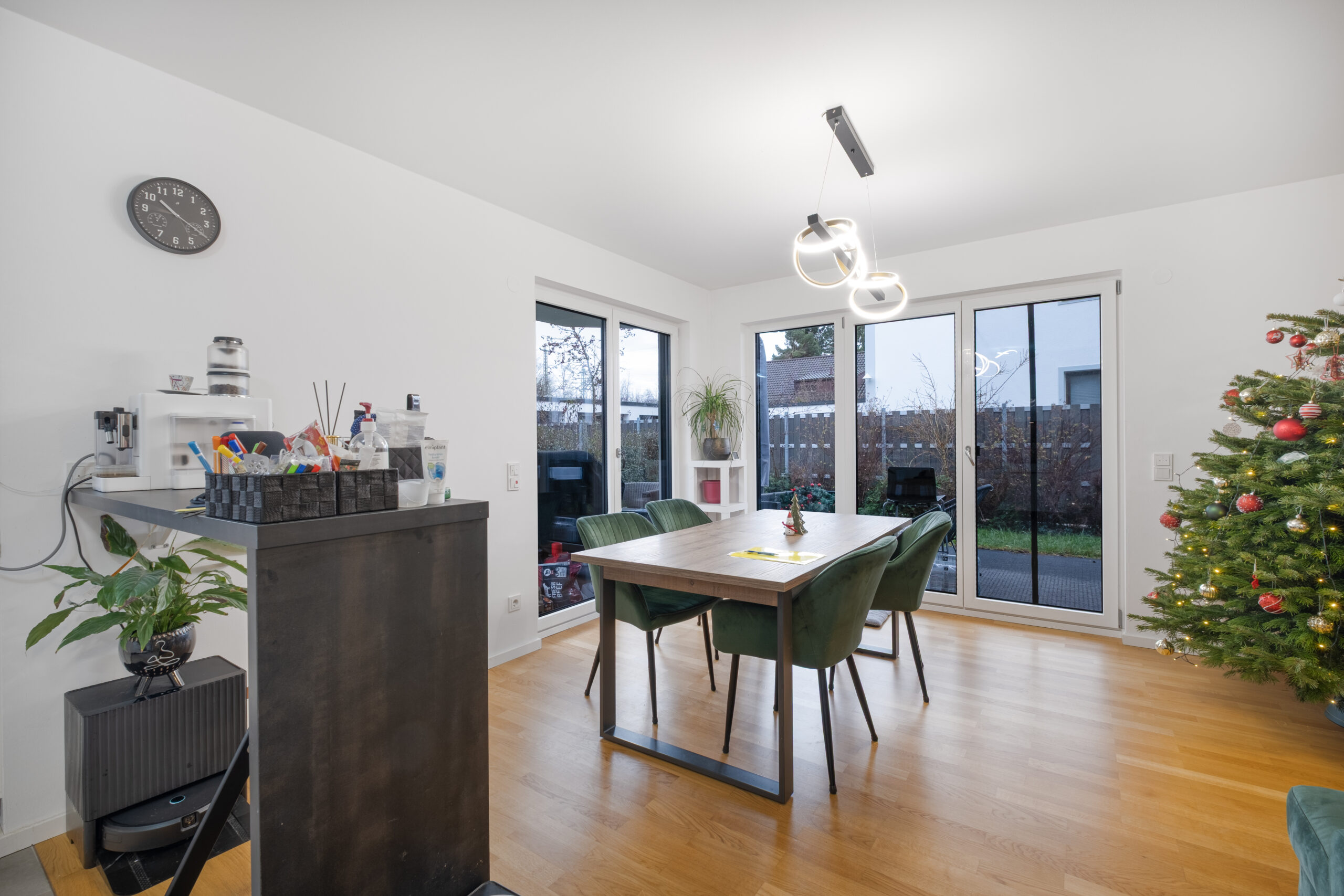 Der großzügige Wohn- und Essbereich mit bodentiefen Fenstern schafft ein offenes Wohngefühl und bietet direkten Zugang zum 105 m² großen Privatgarten.