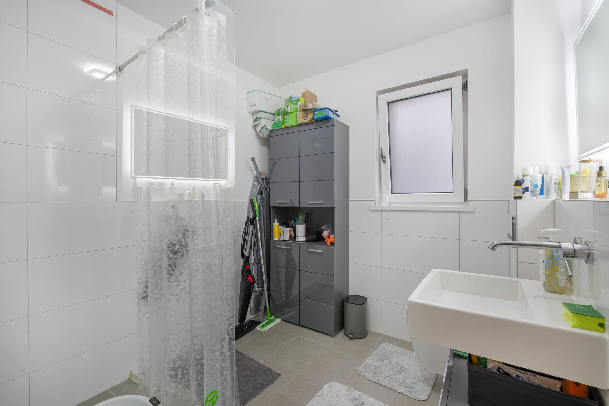 - Tageslichtbad mit weißen Fliesen und moderner Walk-in-Dusche