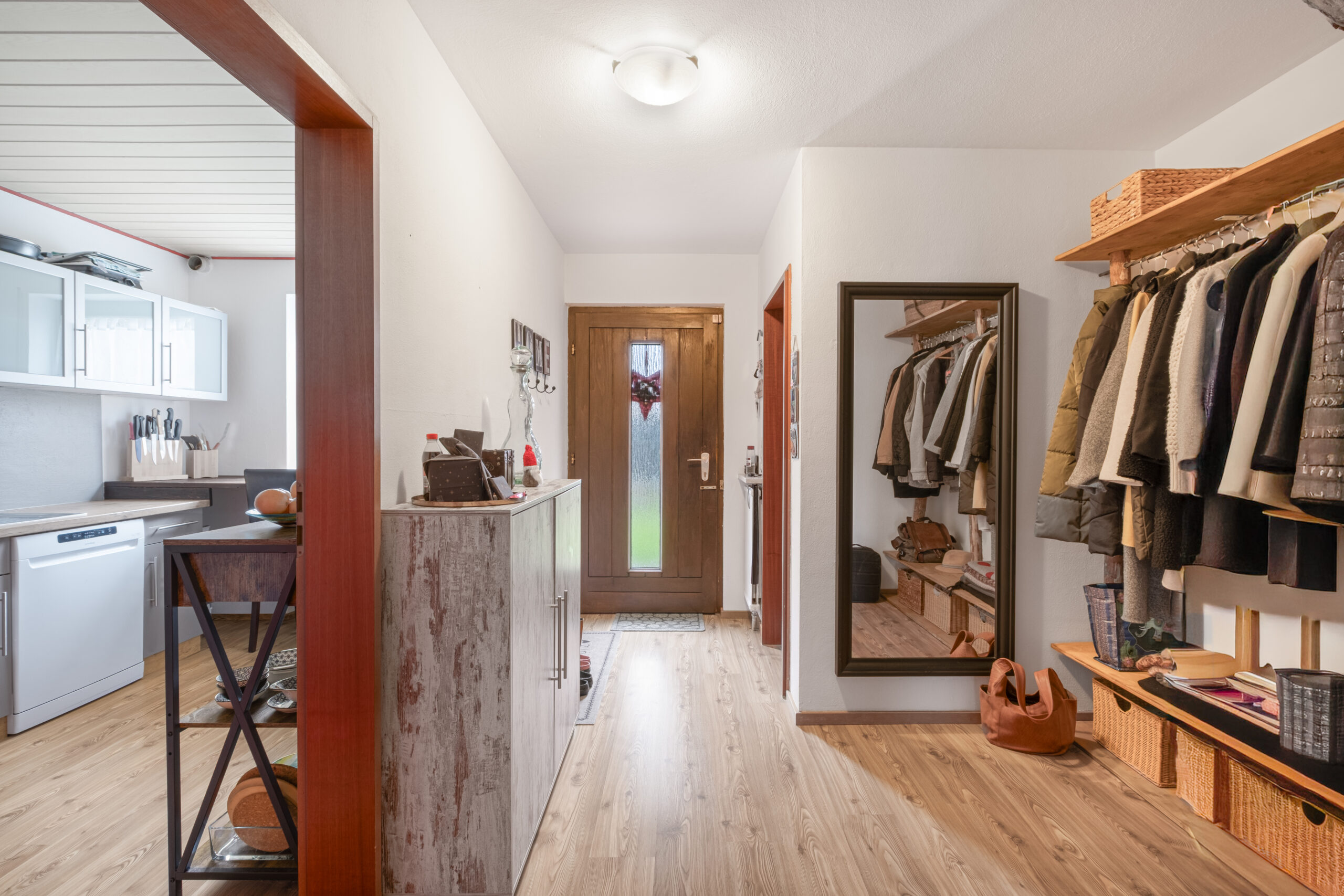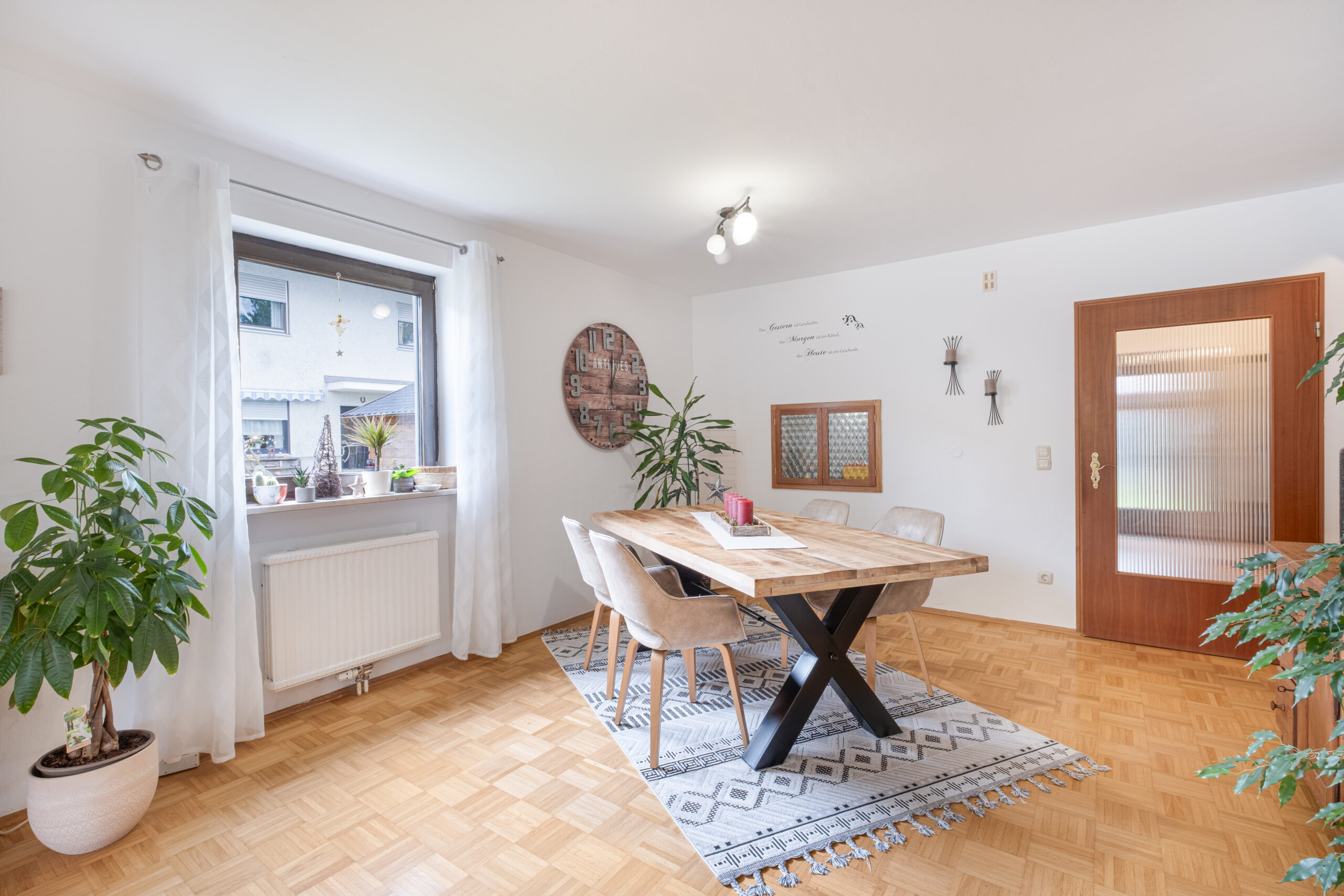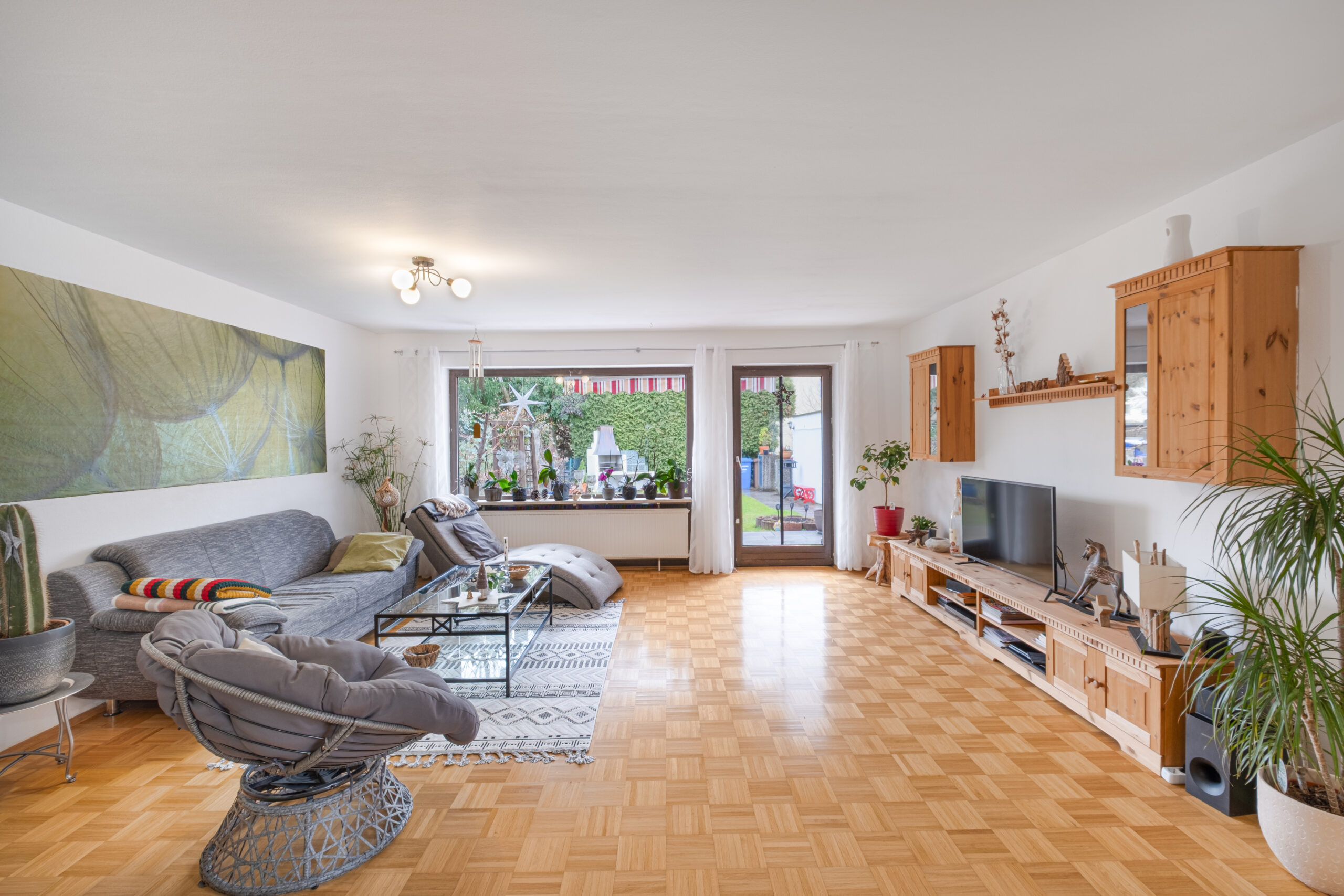 Das großzügige Wohn- und Esszimmer überzeugt mit lichtdurchfluteten Fenstern und direktem Zugang zum weitläufigen Garten. Perfekt für Spiel, Entspannung und gesellige Grillabende.