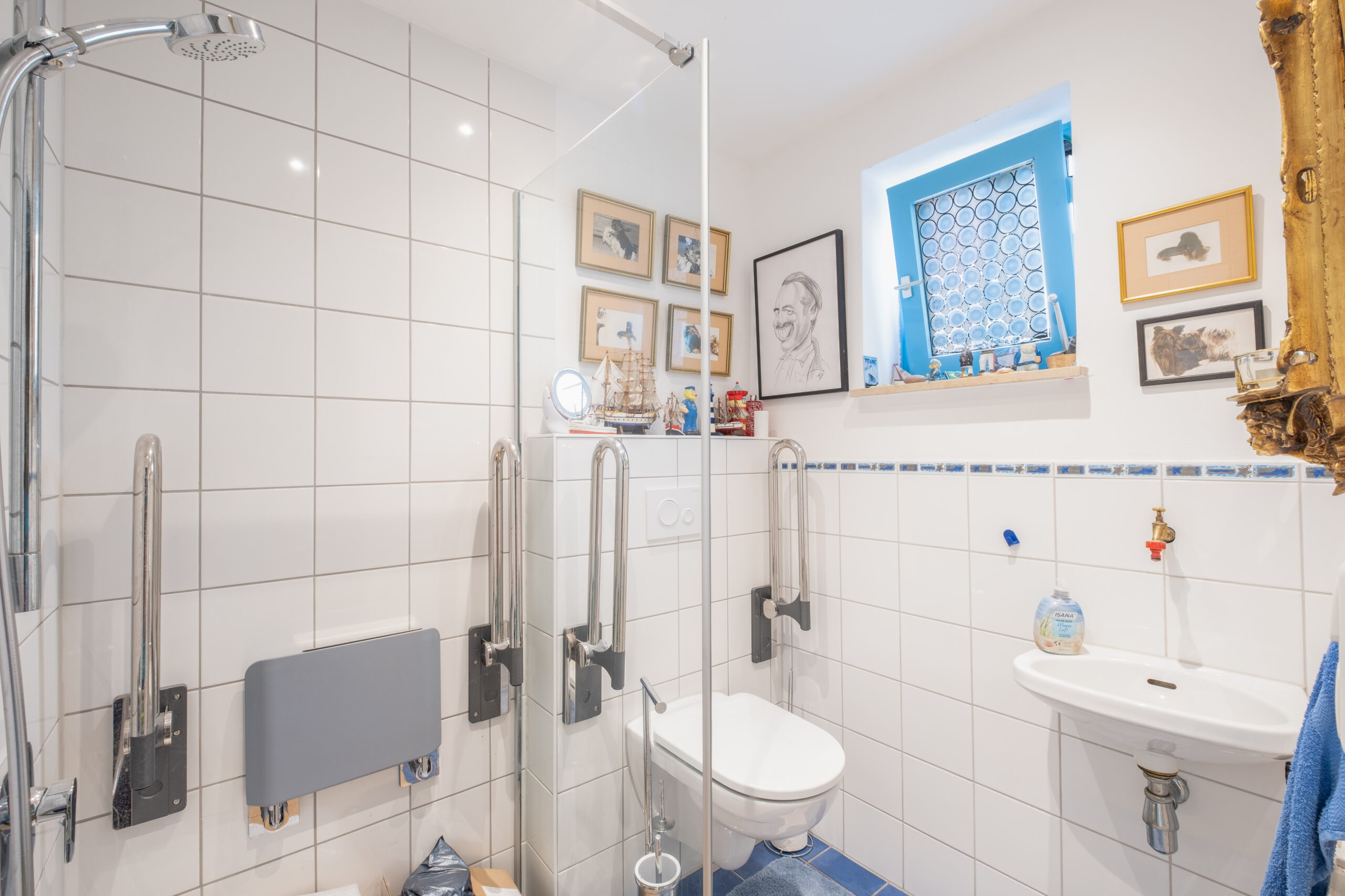 Gepflegtes Gäste-WC im Erdgeschoss, ausgestattet mit einer modernen, ebenerdigen Dusche und zeitlosen Steinzeugfliesen.